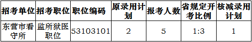 東營市2016年公務員招錄報名工作已結束,根據省委組織部、省人力資源社會廳、省公務員局《關于印發2016年度全省考試錄用公務員工作實施方案的通知》(魯人社發〔2016〕11 號)和《東營市各級機關及直屬單位考試錄用公務員公告》的有關規定,東營市看守所監所獄醫職位因未達到規定開考比例應核減錄用計劃1人。現將核減錄用計劃的職位公告如下: