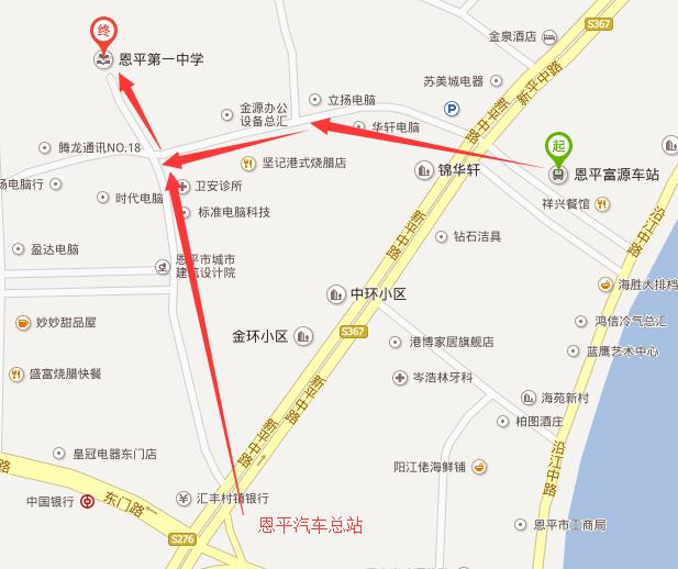 二、考生要盡量選擇乘坐公共交通工具赴考,外地考生可坐車至“恩平富源車站”或“恩平汽車總站”赴考,下車后步行500米或轉乘其它公共交通工具路線如下: