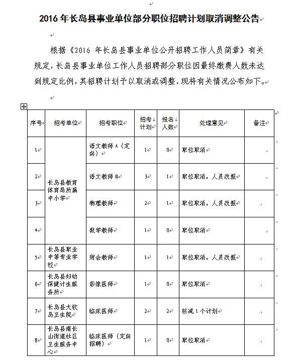 2016山東長島縣事業單位招聘職位計劃取消調整公告