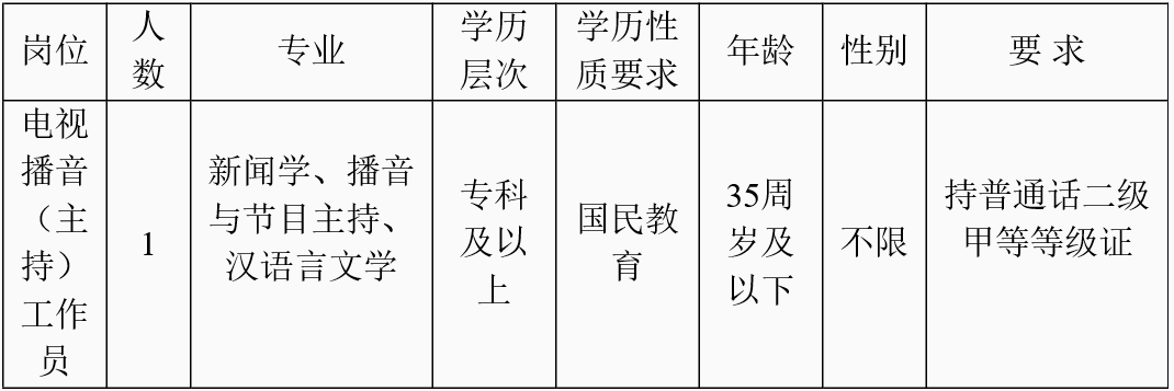 經(jīng)寧洱縣文體廣電旅游局研究,報寧洱縣人民政府、普洱市人力資源和社會局批準(zhǔn),2016年寧洱縣廣播電視臺公開招聘電視播音(主持)工作人員1名,現(xiàn)將公開招聘的有關(guān)事項公告如下: