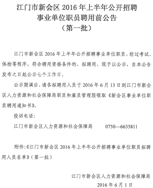 2016上半年廣東江門市新會區招聘事業單位職員聘前公告(第一批)