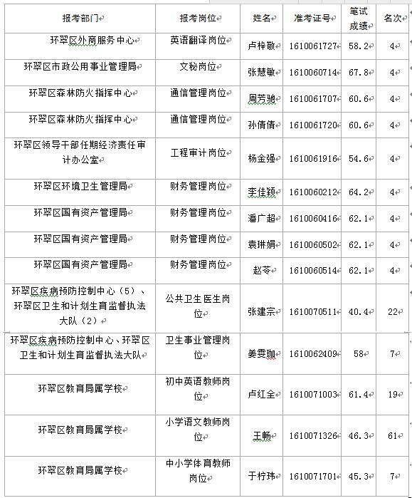 根據(jù)《關于確定2016年威海市環(huán)翠區(qū)屬事業(yè)單位公開招聘筆試合格分數(shù)線和面試資格審查有關問題的通知》規(guī)定,面試人選因資格審查不合格、棄權或遞補棄權造成職位上的人員空缺,由招錄機關按筆試成績依次遞補。現(xiàn)將遞補名單予以公布。請下列考生于6月12日下午4點之前提交資格審查材料,具體要求見《關于確定2016年威海市環(huán)翠區(qū)屬事業(yè)單位公開招聘筆試合格分數(shù)線和面試資格審查有關問題的通知》。