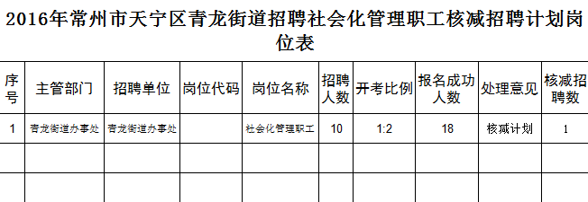 原標題:2016年常州市天寧區青龍街道招聘社會化管理職工核減招聘崗位的公告