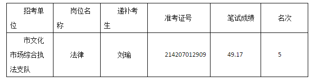 鄂州市文體新廣系統2016年事業單位公開招聘資格復審,因市文化市場綜合執法支隊法律崗位第2名考生劉家麟放棄資格復審,根據《鄂州市事業單位2016年度公開招聘工作人員公告》有關規定,在報考同一崗位考生中按照筆試成績從到低分依次遞補的原則,遞補以下考生為資格復審人選: