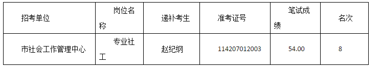 鄂州市民政局系統2016年事業單位公開招聘資格復審,因第4名考生向前放棄資格復審,根據《鄂州市事業單位2016年度公開招聘工作人員公告》有關規定,在報考同一崗位考生中按照筆試成績從到低分依次遞補的原則,遞補以下考生為資格復審人選: