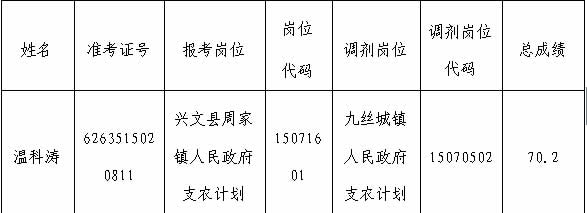 根據(jù)《2016年四川省高校畢業(yè)生“三支一扶”計(jì)劃招募公告》的規(guī)定,對(duì)有人參加筆試,無人參加面試的崗位,縣人力資源社會(huì)部門可在本縣報(bào)考同一項(xiàng)目中參加面試且同意調(diào)劑的考生中從到低分進(jìn)行調(diào)劑招募。報(bào)考我縣九絲城鎮(zhèn)人民政府支農(nóng)計(jì)劃(崗位代碼:15070502)一考生主動(dòng)放棄面試資格出現(xiàn)缺額,經(jīng)研究,決定調(diào)劑,現(xiàn)就調(diào)劑相關(guān)事項(xiàng)公告如下: