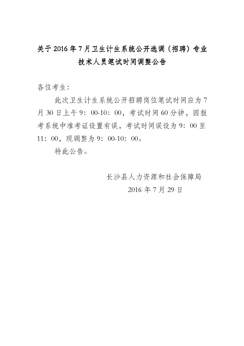 2016年7月湖南長沙市長沙縣衛(wèi)生計(jì)生系統(tǒng)選調(diào)專業(yè)技術(shù)人員筆試時(shí)間調(diào)整公告