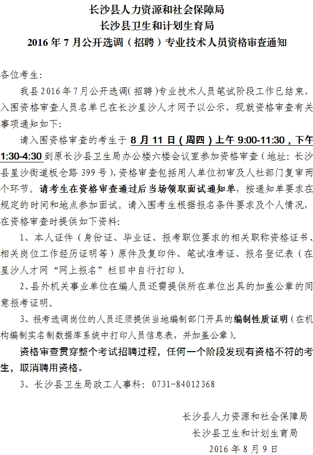 原標題:2016年7月公開選調(招聘)專業技術人員資格審查通知