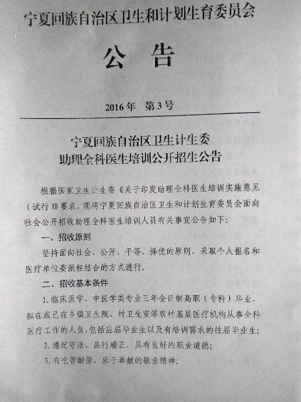 2016寧夏回族自治區衛生計生委助理全科醫生培訓招生公告【招50人】