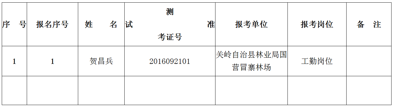 根據(jù)《關(guān)嶺自治縣林業(yè)局2016年公開比選事業(yè)單位比選公告》要求,報名及資格審查工作已經(jīng)結(jié)束,資格審查合格1人,進(jìn)入面試人員1人。現(xiàn)將進(jìn)入面試人員公示及相關(guān)事宜公告如下: