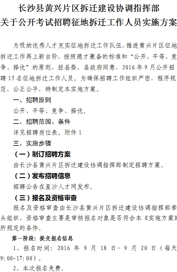 原標題:長沙縣黃興片區拆遷建設協調指揮部關于公開考試招聘征地拆遷工作人員實施方案