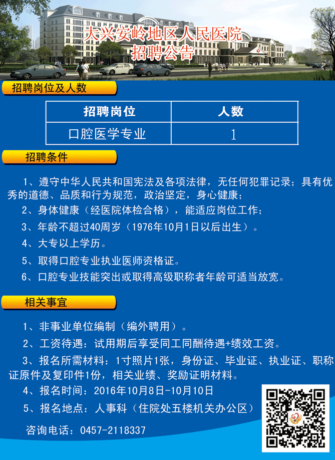 2016黑龍江大興安嶺地區人民醫院口腔醫學專業招聘公告【招1人】