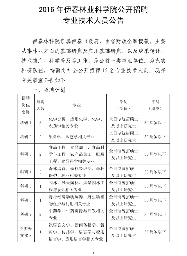 2016黑龍江伊春林業科學院招聘15名專業技術人員公告