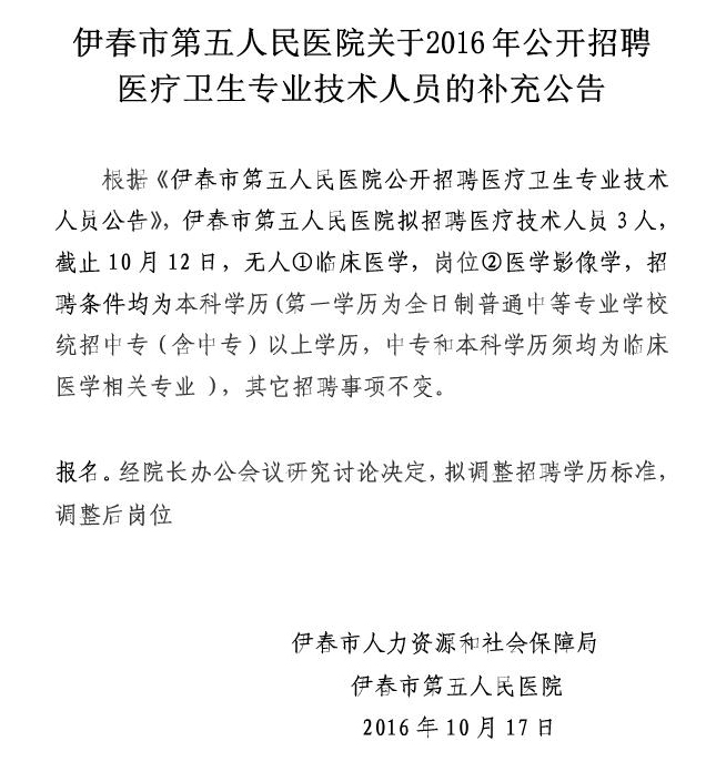 原標題:伊春市第五人民醫院關于2016年公開招聘醫療衛生專業技術人員的補充公告