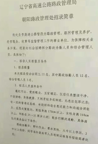 2016遼寧省高速公路路政管理局朝陽路政管理處招聘【招15人】