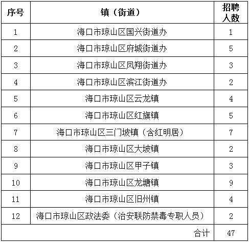 2017年海南省海口市瓊山區各鎮街道辦招聘公告(47人)