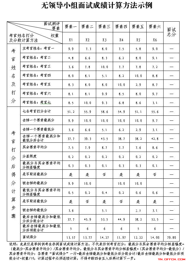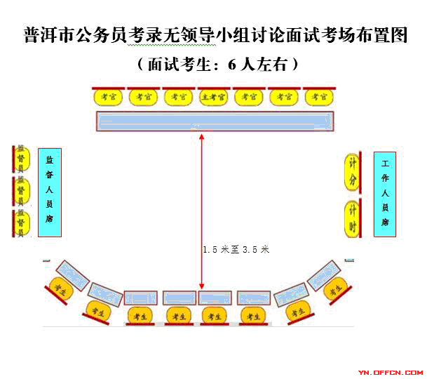 (3)每個面試考場人員安排為考官7人(主考官1人,其他考官6人,面試考場成立面試考官小組,主考官為面試考官小組組長),計分2人,引導員1人,人大監督員1人,政協監督員1人,考生一般每個考場每輪8人左右。