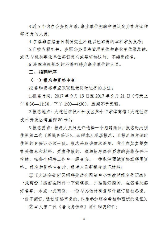 2017大連金普新區招聘勞動合同制中小學教師93人公告