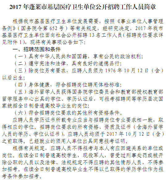 2017山東蓬萊市基層醫療衛生單位招聘13人簡章