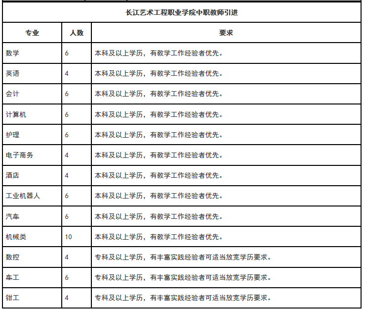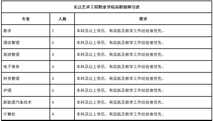 2.報名方式:請將個人簡歷、個人證件掃描件(畢業(yè)證、學歷證、資格證書等其它個人能力證明材料)以附件形式,按“應聘專業(yè)+姓名+畢業(yè)+學歷+專業(yè)+高校人才網(wǎng)”命名(如:“護理+張三+長江藝術工程職業(yè)學院+碩士+護理學+高校人才網(wǎng)”),將簡歷發(fā)送至cjysgc@126.com郵箱,請勿重復投遞。