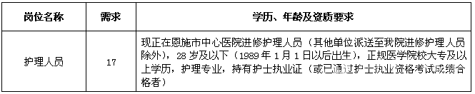 因我院工作需要,現(xiàn)面向正在恩施市中心醫(yī)院進(jìn)修中人員招聘護(hù)理人員17名,相關(guān)事宜公告如下: