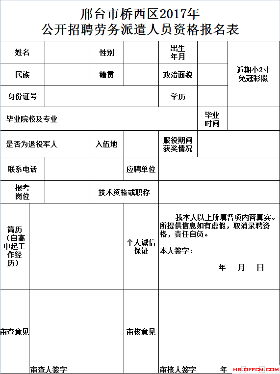 2、邢臺(tái)市橋西區(qū)2017年公開(kāi)招聘勞務(wù)派遣人員資格報(bào)名表
