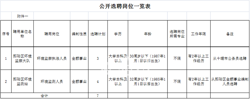 2.區(qū)環(huán)境監(jiān)測(cè)站:環(huán)境監(jiān)測(cè)崗位4人,面向鄖陽(yáng)區(qū)全額事業(yè)編制人員公開(kāi)選聘。(具體崗位及條件要求詳見(jiàn)附件一)