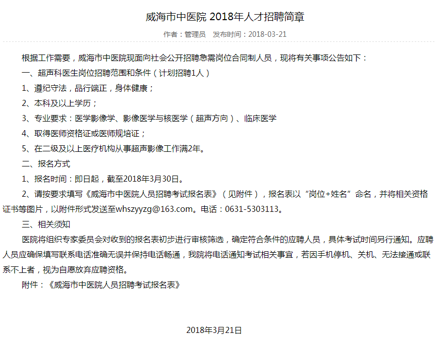 2018年山東威海市中醫(yī)院人才招聘1人簡(jiǎn)章
