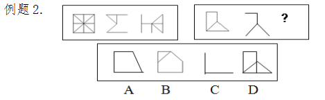 圖形推理試題主要考查應考者抽象推理的能力。要求考生從四個備選答案中選擇最符合規律的一個,替代題干中的問號,使圖形呈現出一定的規律性。試題包括多種類型,僅舉其中一種類型為例。