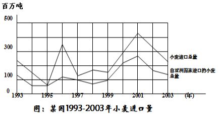 1.從1993年到1997年中,該國共從亞洲國家進口多少小麥(百萬噸)?( )