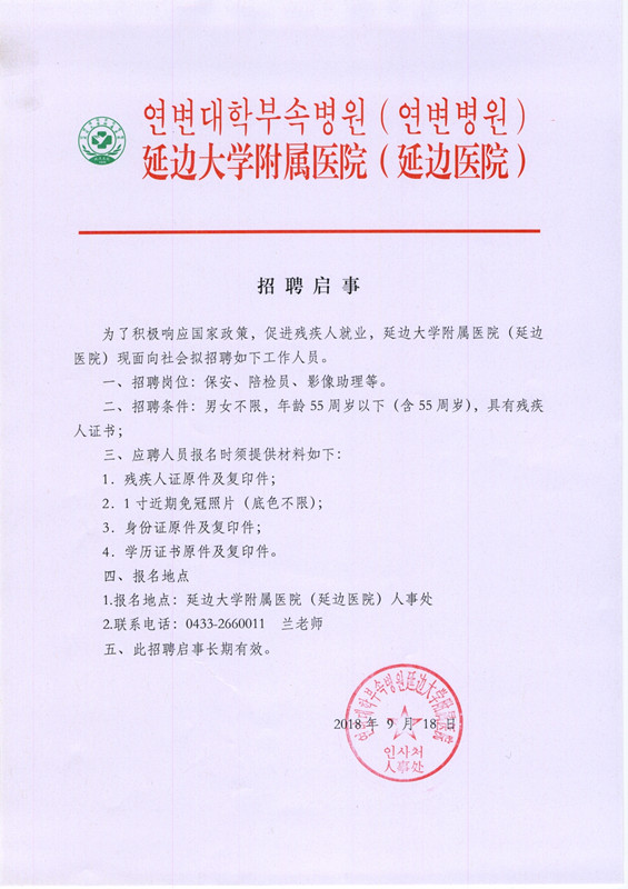 本文章轉自延邊大學附屬醫院官方網站,原標題為:招聘啟事1