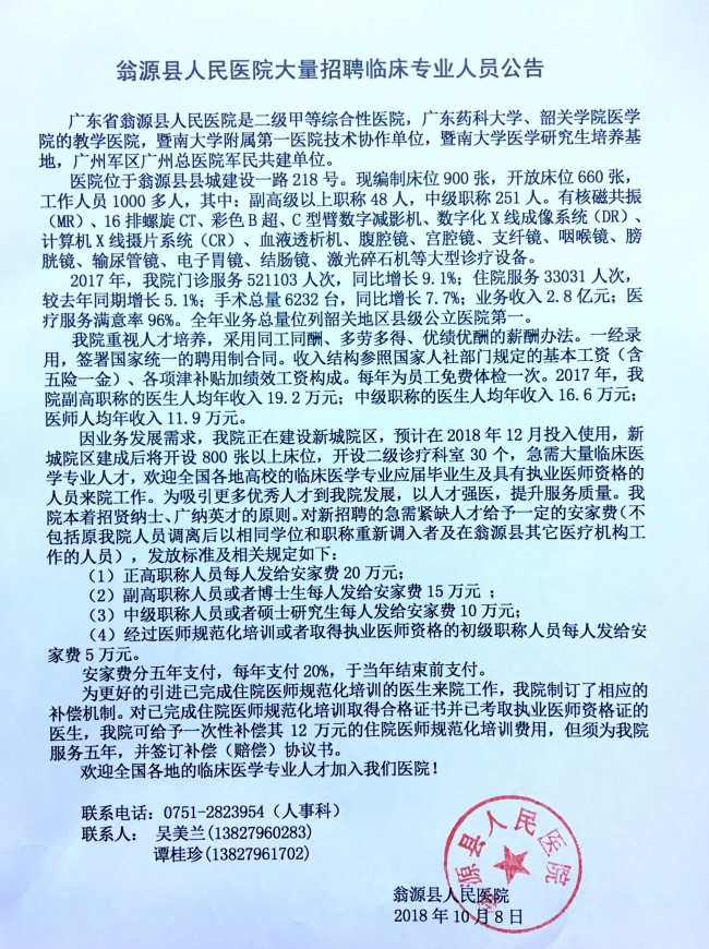2018廣東韶關市翁源縣人民醫(yī)院大量招聘臨床專業(yè)人員公告