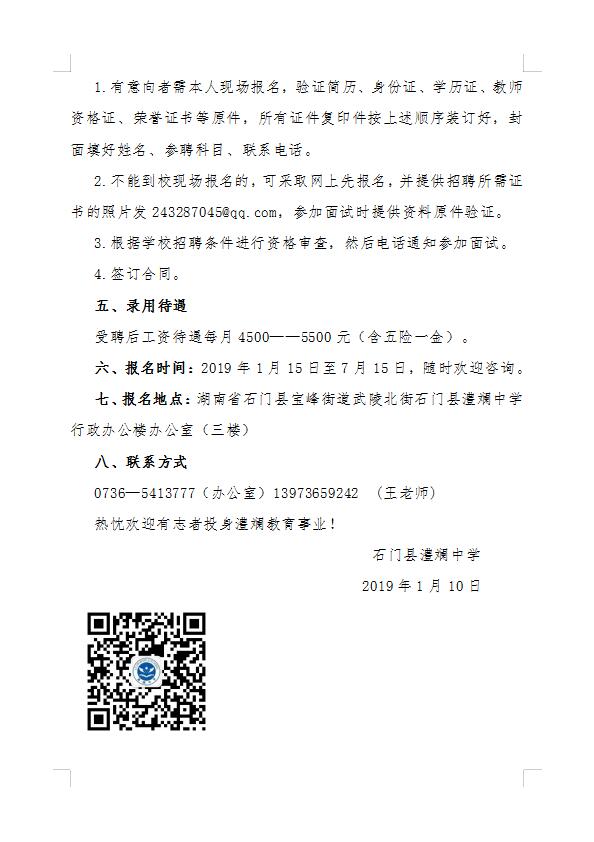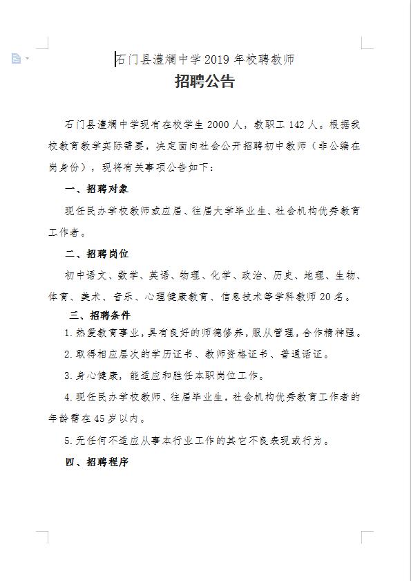 原標題:石門縣澧斕中學2019年校聘教師招聘公告