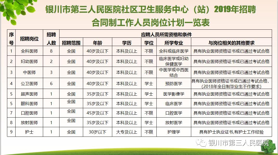 2019寧夏銀川市第三人民醫(yī)院社區(qū)衛(wèi)生服務(wù)中心招聘24人公告