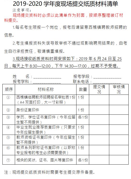 ①西樵鎮臨聘教師招聘報名審批表1份(見附件3,要求單張A4紙雙面打印,相片為近期大一寸彩照);