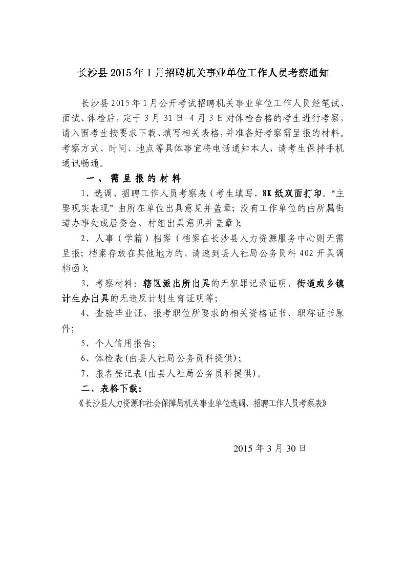 2015年1月湖南省長沙縣機關事業單位招聘考察通知
