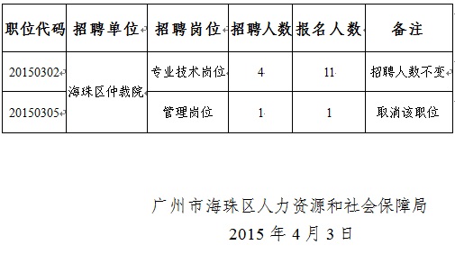 現將2015年海珠區勞動人事爭議仲裁院公開招聘事業編制工作人員部分崗位報名人數達不到開考比例作相應調整的通知如下: