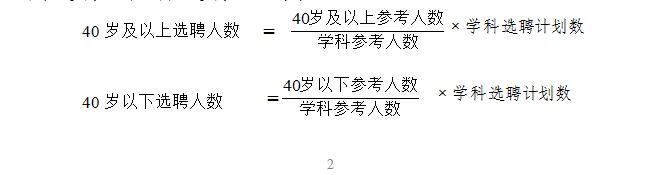 報考中小學教師的按考試、考核總成績從高到低選聘(總成績為文化考試成績40%的折后分加上考核分)。選聘計劃為1人的不分年齡段錄聘;選聘名額在1人以上的,按年齡段(40歲及以上和以下,以1979年7月31日為界)分學科按比例選聘,具體選聘公式為:
