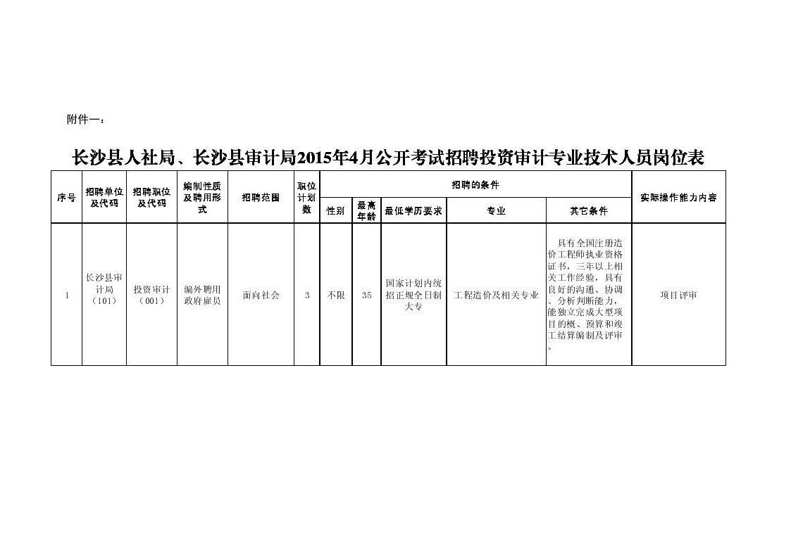 原標題:長沙縣人力資源和社會局、長沙縣審計局2015年4月公開考試招聘投資審計專業技術人員簡章