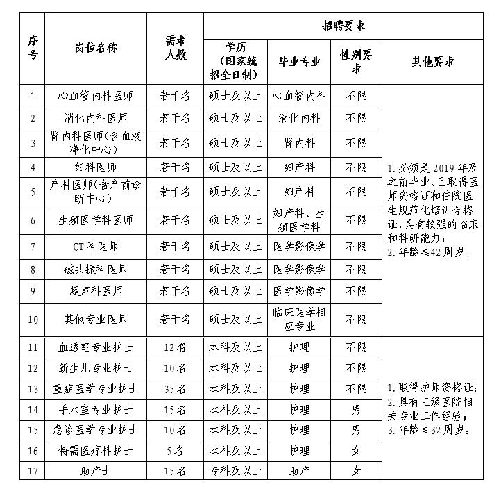 根據(jù)醫(yī)院業(yè)務(wù)發(fā)展需要,擬招聘一批醫(yī)務(wù)人員。具體招聘崗位、人數(shù)及招聘要求如下: