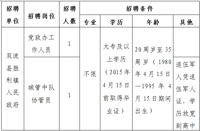 2015年四川省雙流縣勝利鎮(zhèn)人民政府派遣制人員招聘公告【招2人】
