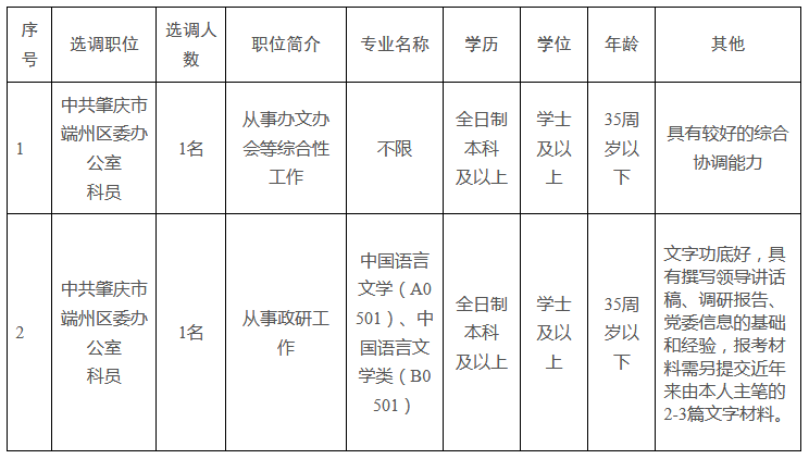 根據工作需要,中共肇慶市端州區委辦公室公開選調公務員2名。現將有關事項公告如下: