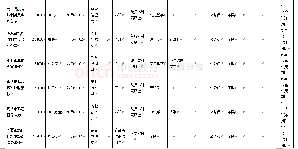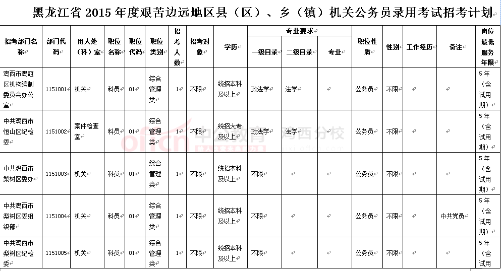 2015年黑龍江省艱苦邊遠地區公務員考試招錄雞西地區職位表