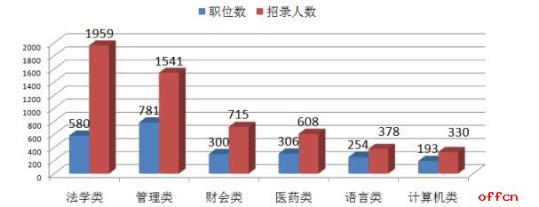 本次考試共有905個職位不限專業,占總職位數的20%,與去年一樣。不限專業職位共招錄1709人,占總招錄人數的26%,略低于去年的30%。據中公網校統計,本次考試最熱門的六大專業為法學類、管理類、財會類、醫藥類、語言類、計算機類。