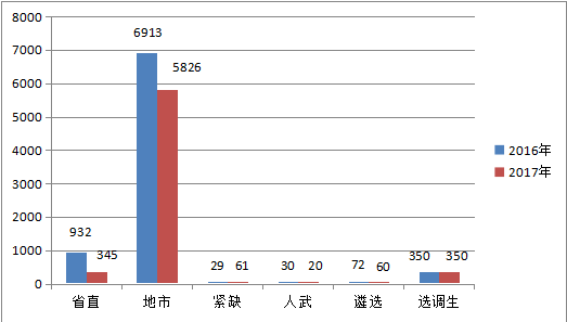 2017年浙江省公務員考試的招錄人數呈現遞減趨勢,但是,今年也有增加,如殘疾人招錄人數增加、公務員遴選與省考同步進行、選調生數量不變等等。具體如下圖: