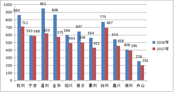 而對于浙江省公務員考試中,各地市的招錄,從數據上,也有遞減趨勢。具體數據,如下圖: