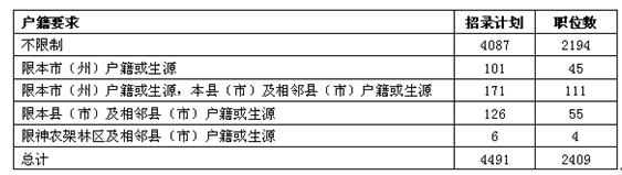 今年招錄4491人、2409個職位,其中省直機(jī)關(guān)招錄127人,市州、直管市、神農(nóng)架林區(qū)招錄3425人,省垂管系統(tǒng)725人,省監(jiān)獄系統(tǒng)214人。